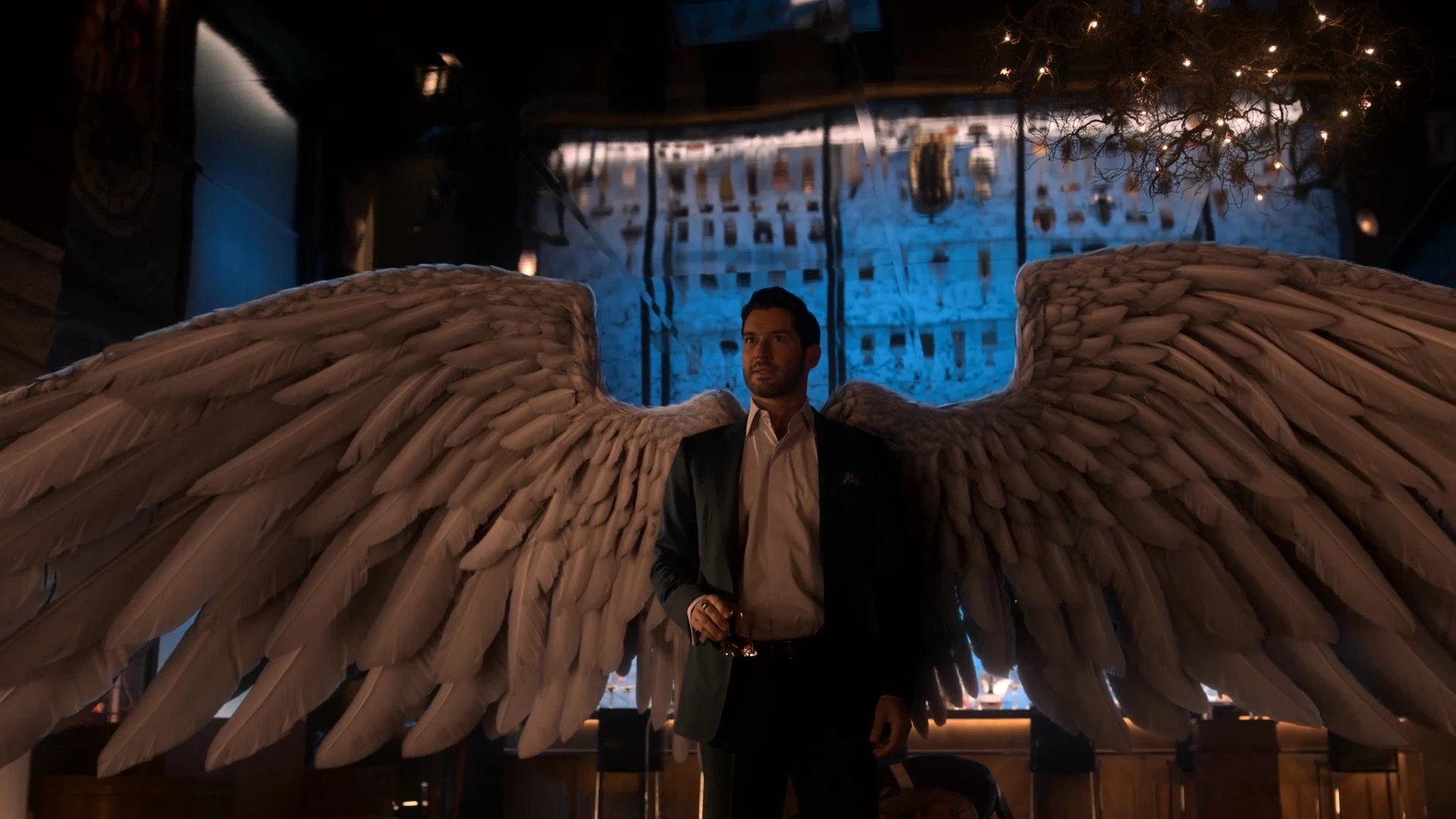 He wears the black wings roblox accessory but reskinned to be crimson.